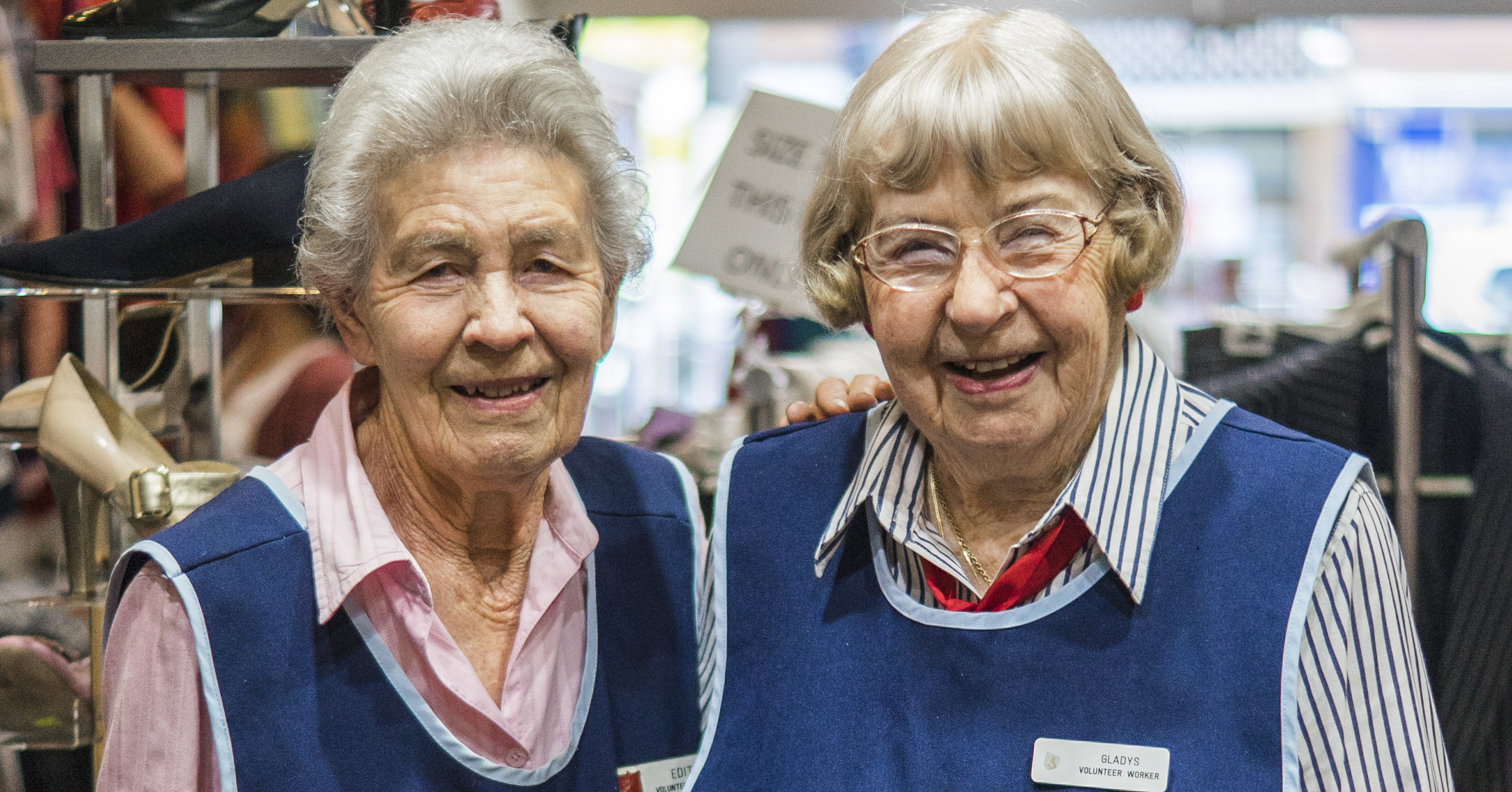 Caption: Between them, Edith Holland (left) and Gladys Kidd have clocked up 60 years of volunteering at Family Stores' in Sydney's north.