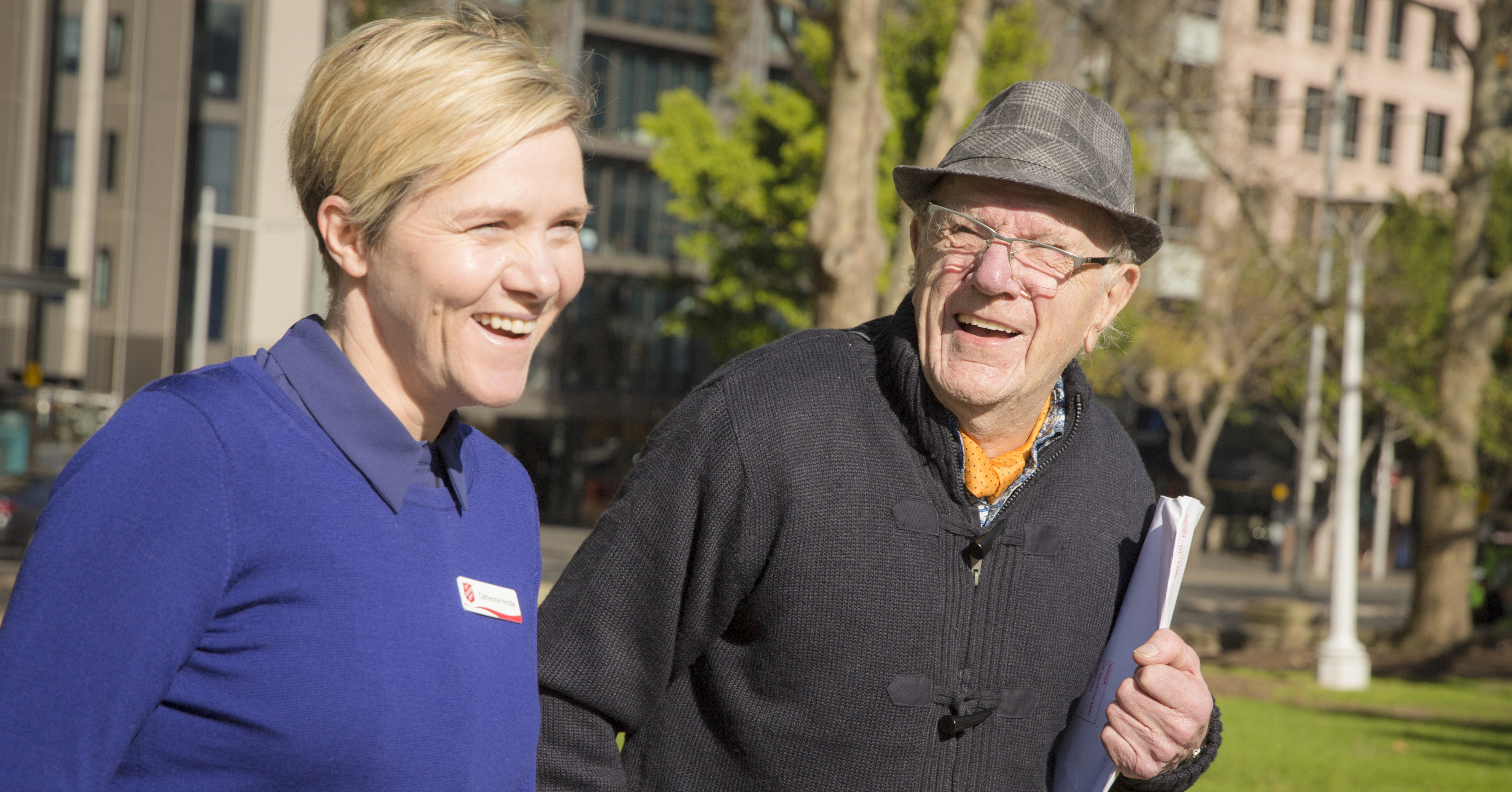 Caption: Salvation Army representative Catherine Hindle catches up with George (right), who attributes his quality of life to the Salvos