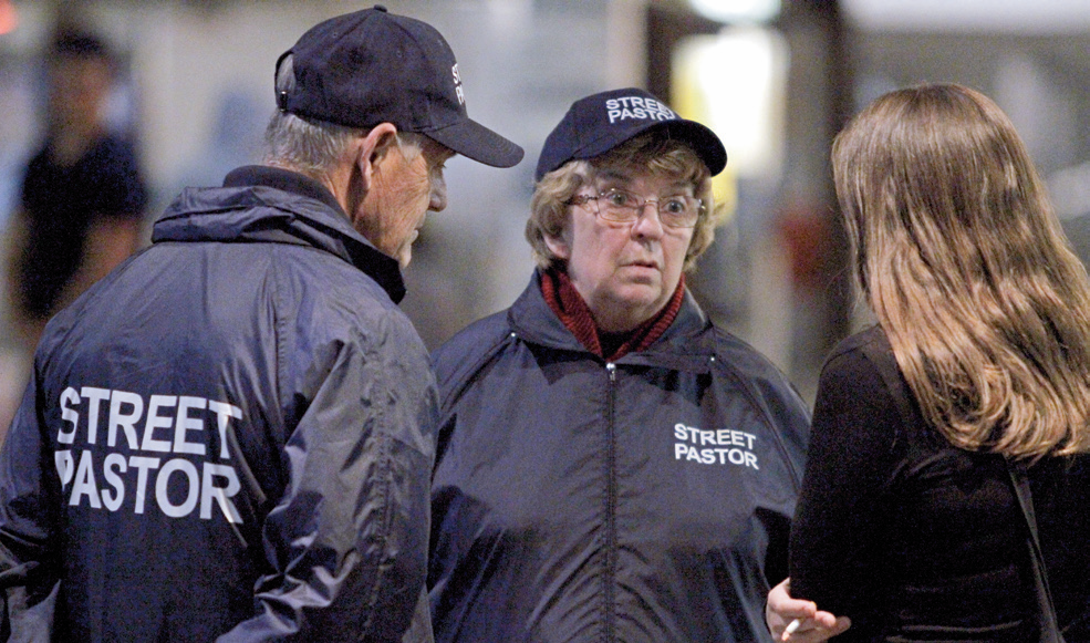 Team members are highly visible, wearing distinctive blue caps, t-shirts and spray jackets, emblazoned with the words ‘Street Pastor’.