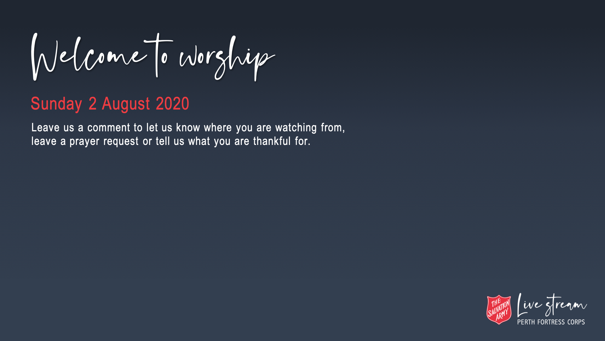 Thank you for joining us in our online service. Stay connected to us through: Email: perthfortress@salvationarmy.org.au Website: https://www.salvationarmy.org.au/perthfortress/ Facebook: https://www.facebook.com/perth.fortress.corps