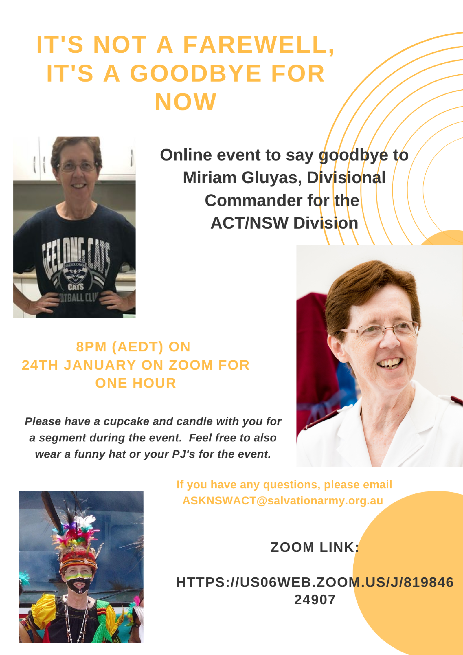 The Zoom link to the event is Divisional Farewell Service for our former Divisional Commander Miriam Gluyas